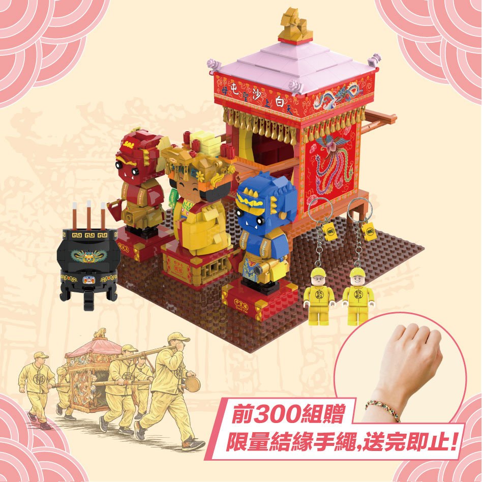 本優惠組合含,白沙屯媽祖積木組1組+粉紅超跑積木組1組+黑香爐積木1組+抬轎人鑰匙圈2入(款式隨機)
